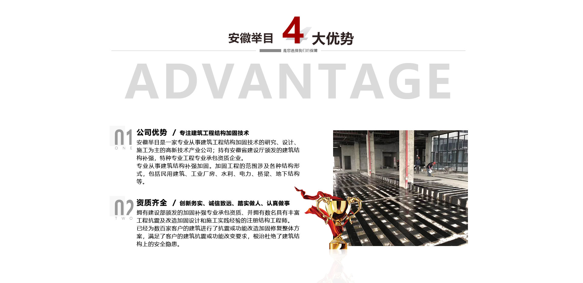 安徽舉目工程加固有限公司是一家專業(yè)從事建筑工程結(jié)構(gòu)加固技術(shù)的研究、設(shè)計、施工為主的高新技術(shù)產(chǎn)業(yè)公司,成立于2012年。持有安徽省建設(shè)廳頒發(fā)的建筑結(jié)構(gòu)補強,特種專業(yè)工程專業(yè)承包資質(zhì)企業(yè)。專業(yè)從事建筑結(jié)構(gòu)補強加固。加固工程的范圍涉及各種結(jié)構(gòu)形式,包括民用建筑、工業(yè)廠房、水利、電力、橋梁、地下結(jié)構(gòu)等。公司依托高校土木建筑學院、省建筑科學研究機構(gòu)專業(yè)從事建筑結(jié)構(gòu)加固、檢測、鑒定、設(shè)計、施工、公司擁有建設(shè)部頒發(fā)...